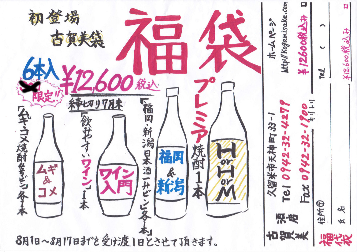 お盆間近!! ツイート 古賀美酒店 初めての「福袋」!! 正確には「福箱」!!(6本入りの一升瓶段ボール)! 7口限定! 7月31日締め切り!! 受け渡し日は 8月1日~8月17日まで 何が入ってるかはお楽しみ♪ 「ムギ焼酎4号瓶」 「コメ焼酎4号瓶」 「赤ワイン」 「福岡の日本酒1升瓶」 「新潟の日本酒1升瓶」 「プレミア焼酎1本」 合計6本¥1万2600(税込) きっと満足出来る一箱♪ 締め切り&予約数に達し次第終了致します!!